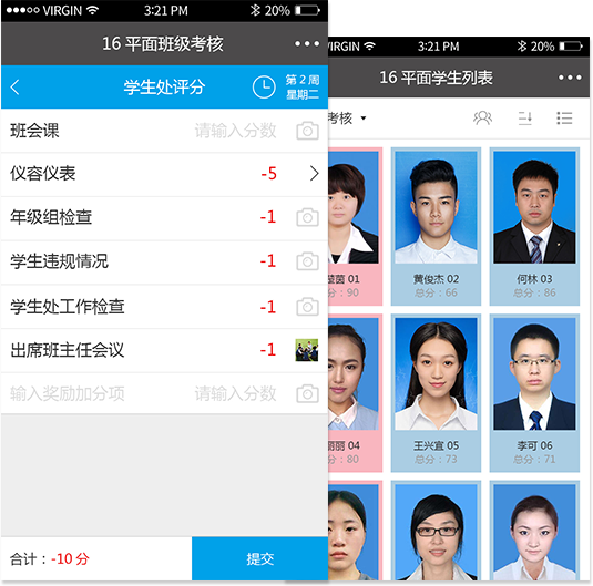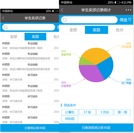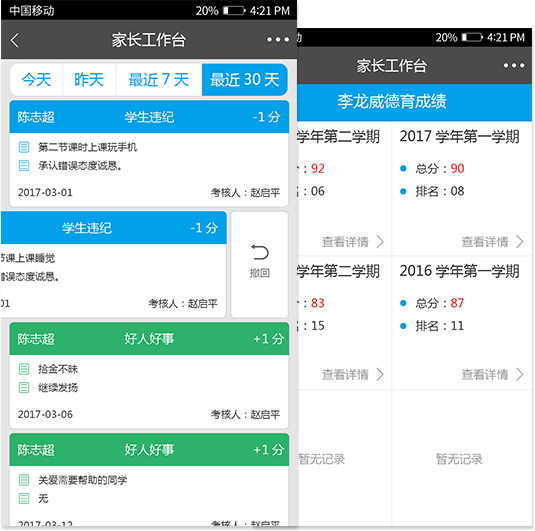 使用智嵌学生德育量化模块后,老师可以随时随地考核学生德育情况,并统计学生、班级的德育量化成绩,方便评比及考核。